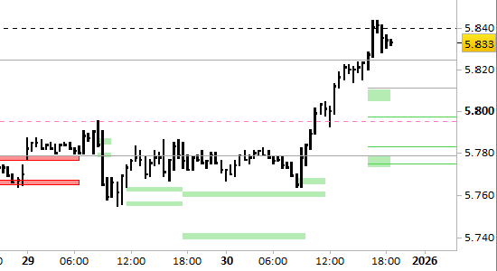future Eurostoxx50, grafico a barre da 30 minuti. Prezzi fino al 30/12/25, ore 18.41, last 5833