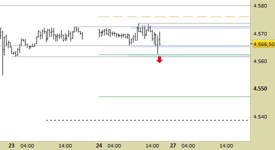 La resistenza è ferma a 4572.00/72.75 ed i supporti a 4565.25/66.00 e 4562.00/63.25.