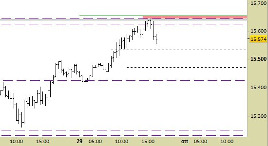future DAX, grafico a barre da 30 minuti. Prezzi al 29/09/23, ore 16.45, last 15574